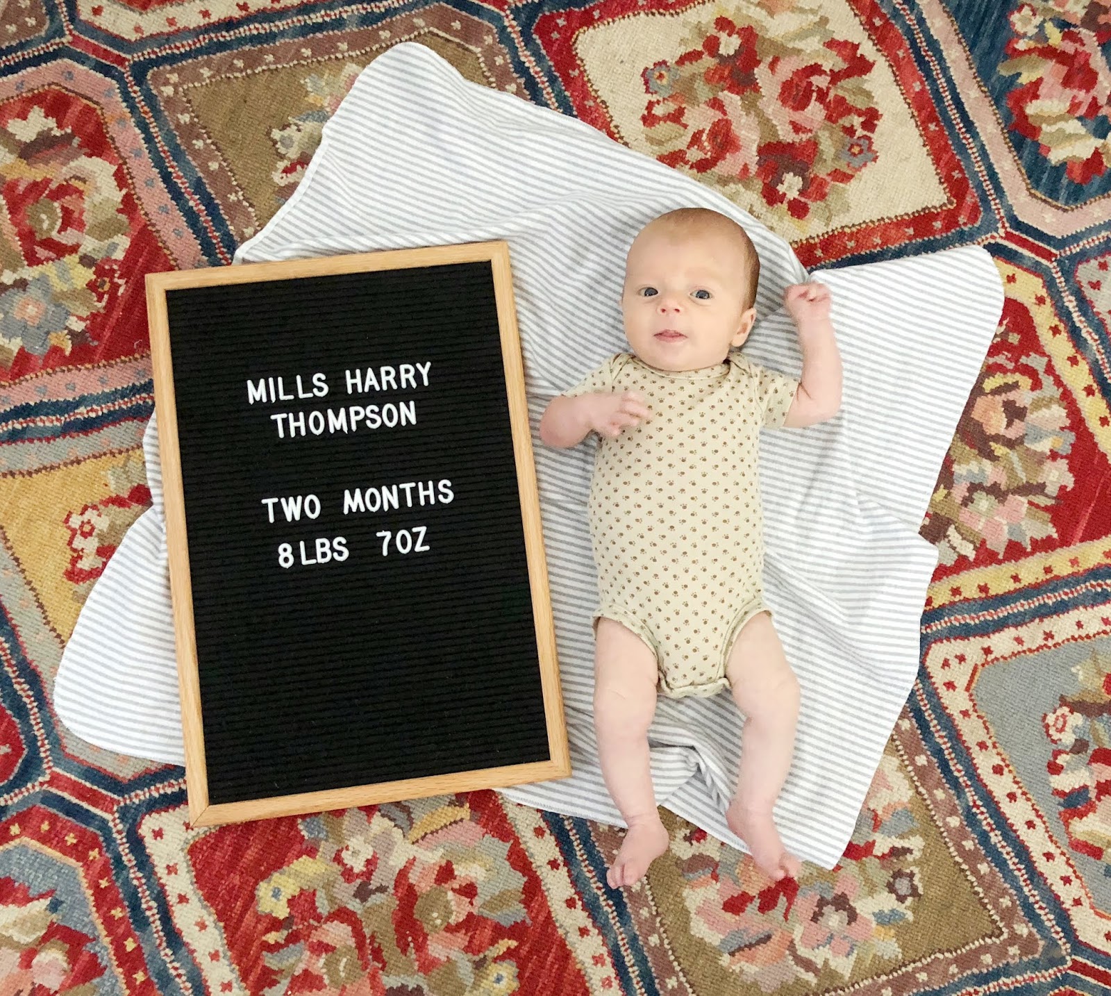 Motherhood so far is such a wonderful, exhausting, beautiful experience. Mills is showing me a new kind of love that I've never known before. Our 8 lb 7 oz boy makes eye contact with us now, grabs onto us with his strong little arms and fists, raises his little head and looks around during tummy time and even rolled over front to back a couple of times!! He loves to stretch out in his crib and watch his mobile and I love seeing him learn and grow every single day. Happy 2 months baby Mills! Thank you for teaching me how to be a mama!